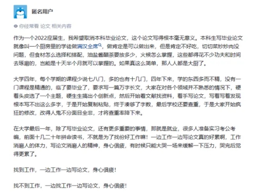 网络上,一名2022级应届生有关是否应该取消本科毕业论文的回答得到了三千多个赞。毕业论文,为部分学子带来身体与精神上的双重负担。