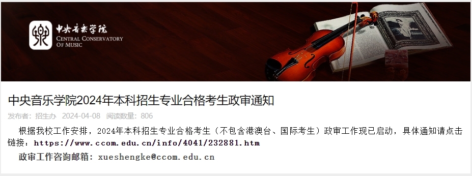 中央音乐学院2024年本科招生专业合格考生政审通知