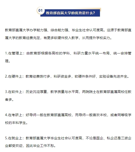 中华人民共和国教育部直接管理一批高等院校,目的是在探索改革上先走一步,在提高教学、科研和社会服务等方面发挥示范作用。