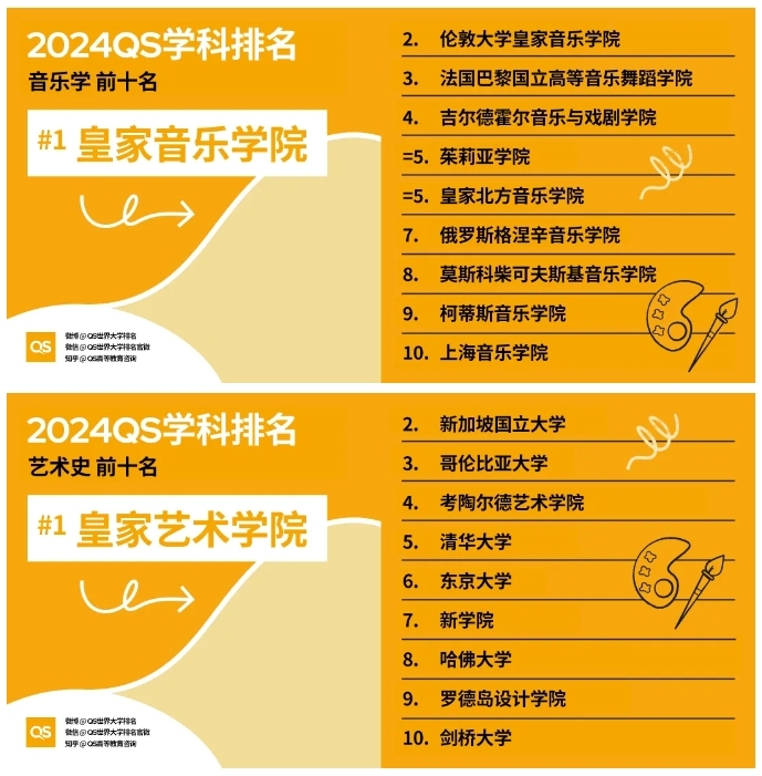 今年的世界大学学科排名分为五个大的学科领域,涵盖了共60个学科。艺术类学科排名如下: