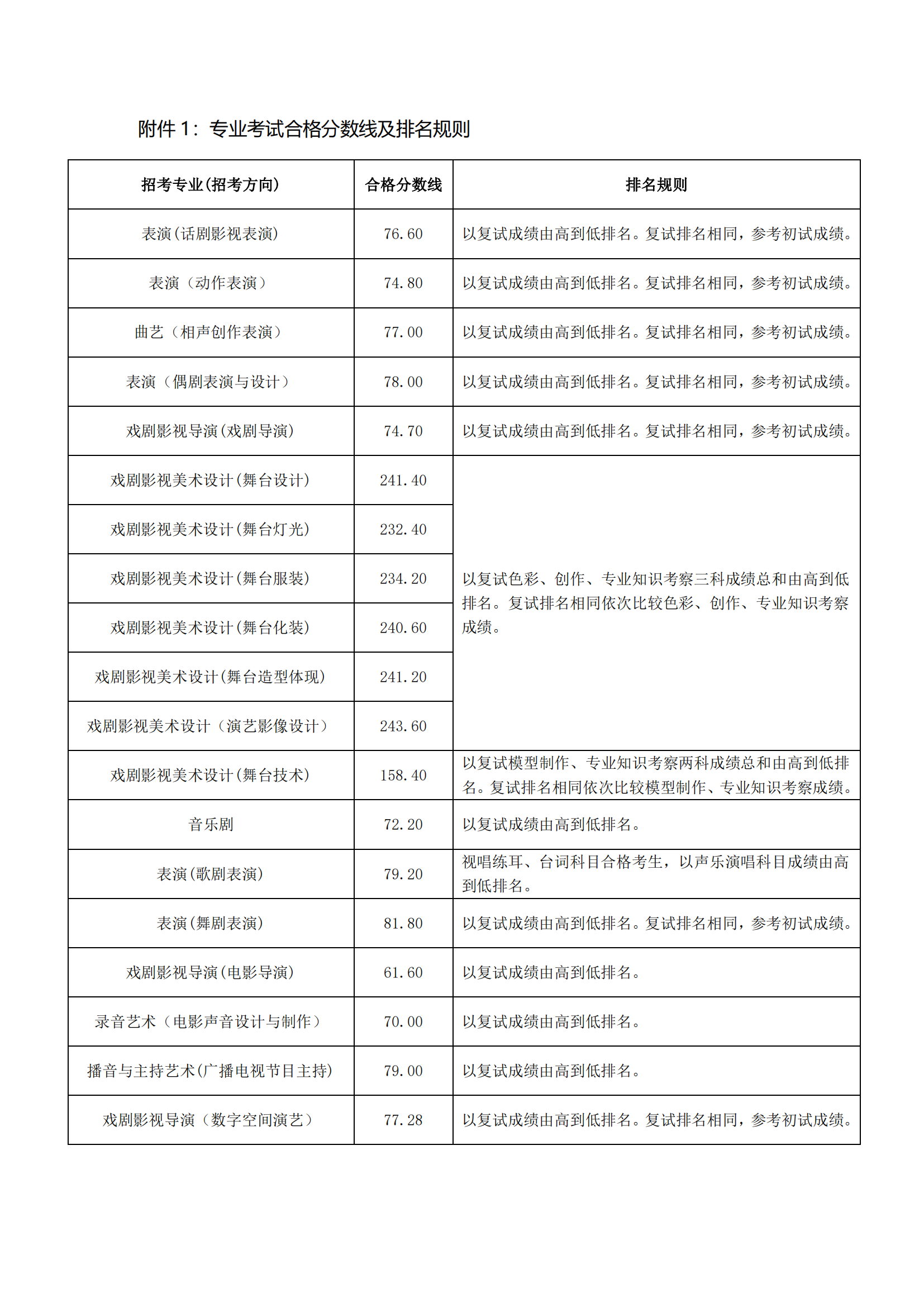 附件1:专业考试合格分数线及排名规则