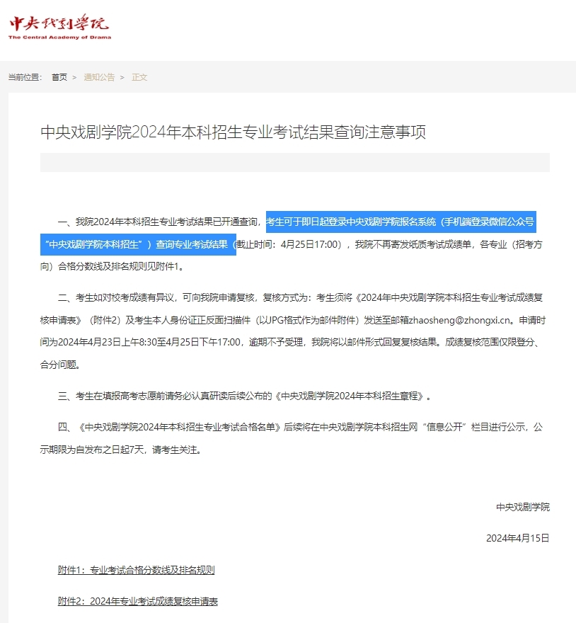 中央戏剧学院2024年本科招生专业考试结果查询注意事项