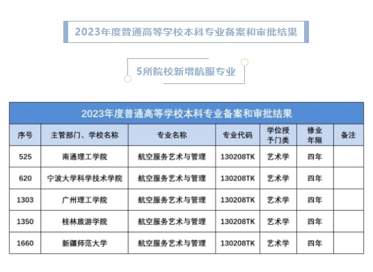 根据教育部公布的《教育部关于公布2023年度普通高等学校本科专业备案和审批结果的通知》,经申报、公示、审核等程序,审批结果公示,其中又新增5所院校开设航空服务艺术与管理专业,这对于准备走航服专业的艺考生来说确实是好消息,不过记得要提前了解目标院校是否在考生所在地招生、招生计划数、对应的省统考专业(一般服表专业居多,也有要求舞蹈专业的)等信息,一般这些内容都会在高校当年的《招生简章》中体现。