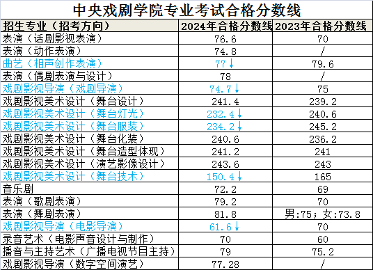 中央戏剧学院发布的2024年本科招生专业考试合格分数线跟2023年相比,除表演(动作表演)、表演(偶剧表演与设计)、戏剧影视导演(数字空间演艺)为2024年新增校考专业外,曲艺(相声创作表演)、戏剧影视导演(戏剧导演)、戏剧影视美术设计(舞台灯光)、戏剧影视美术设计(舞台服装)、戏剧影视美术设计(舞台技术)、戏剧影视导演(电影导演)等6个专业的合格线下降,其他10个专业合格分数线均有所提升。详情如下: