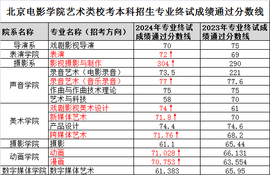 北京电影学院发布2024年艺术类校考本科招生专业终试合格线及成绩,相比2023年,表演、影视摄影与制作、录音艺术(音乐录音)、戏剧影视美术设计、动画、漫画等7个专业合格线上涨,其他7个专业均下降。详情如下: