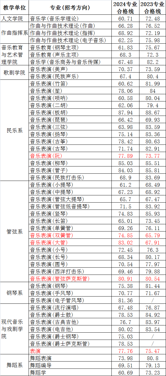 跟2023年相比,除了民乐系的音乐表演(阮)、管弦系的音乐表演(双簧管)、音乐表演(大管)、音乐表演(管弦萨克斯管)、现代音乐与戏剧学院的表演等5个专业的合格线较2023年要高一些外,其他专业的合格线均较2023年低。详情如下: