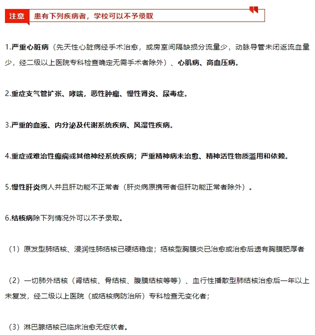 提醒各位考生,在规划高考志愿时,一定要参考高考体检结果和高校专业招生条件。今天给大家梳理了学校可以不予录取的患者疾病,一起来了解一下。