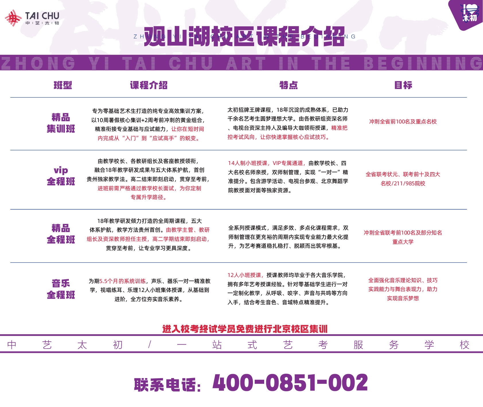 在中艺太初,我们拥有专业的影视表演艺考教研团队,历经多年的教学沉积,准确掌握北电/中戏/上戏/中传/国戏/南艺等各大艺术高校表演专业方向对学子的专业要求及要点,研究全国近百所表演专业高校的学生类型及专业要求,我们坚持着对表演艺考的不懈努力,只是为你考上理想的表演艺术名校。